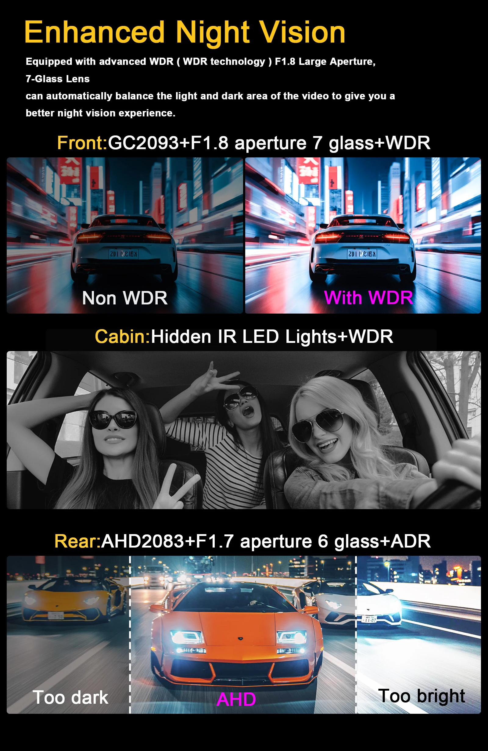 Vision nocturne améliorée L'objectif avant 2K est équipé d'une grande ouverture avancée WDR (technologie WDR) F1.8, de 7 lentilles en verre, l'objectif arrière AHD 1920 * 1080P offre un meilleur effet de vision nocturne la nuit, équilibrant automatiquement les zones claires et sombres de la vidéo, vous offrant une meilleure expérience de vision nocturne. De plus, la lentille intérieure de la voiture a une fonction de vision nocturne infrarouge, qui peut être vue clairement même dans des environnements sombres.
