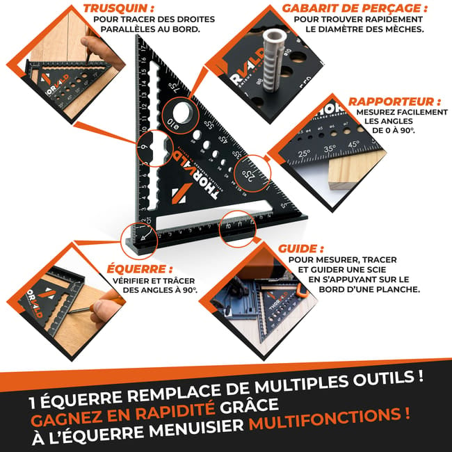 ✅OUTIL 5 EN 1 UNIQUE : VOTRE IMAGINATION DEVIENT LA SEULE LIMITE ! Notre equerre menuisier unique regroupe 5 outils à elle seule : Regle, Equerre, Trusquin de menuisier, Raporteur et Gabarit de Perçage. C'est l’ outil de traçage sur bois le plus complet. Grâce à ses fonctionnalités, vous pourrez confectionnez tout ce que vous voulez !