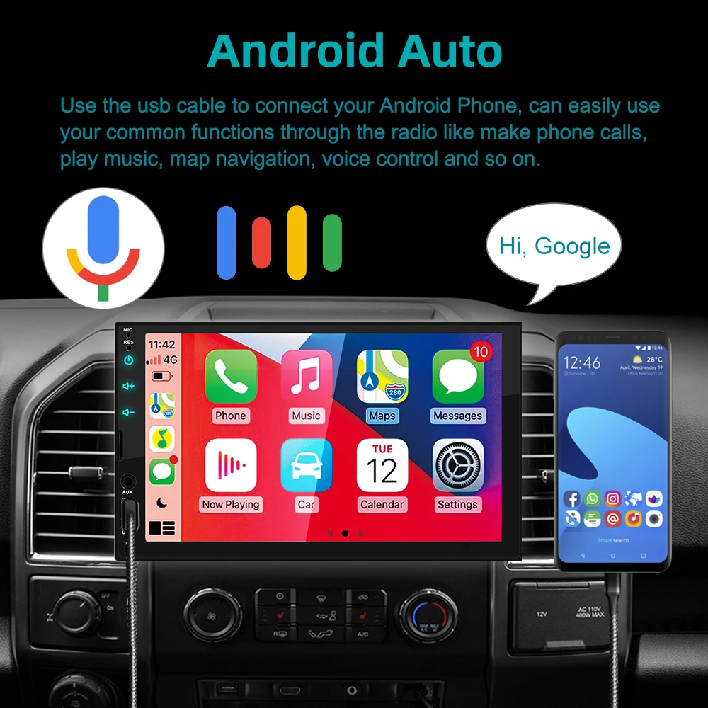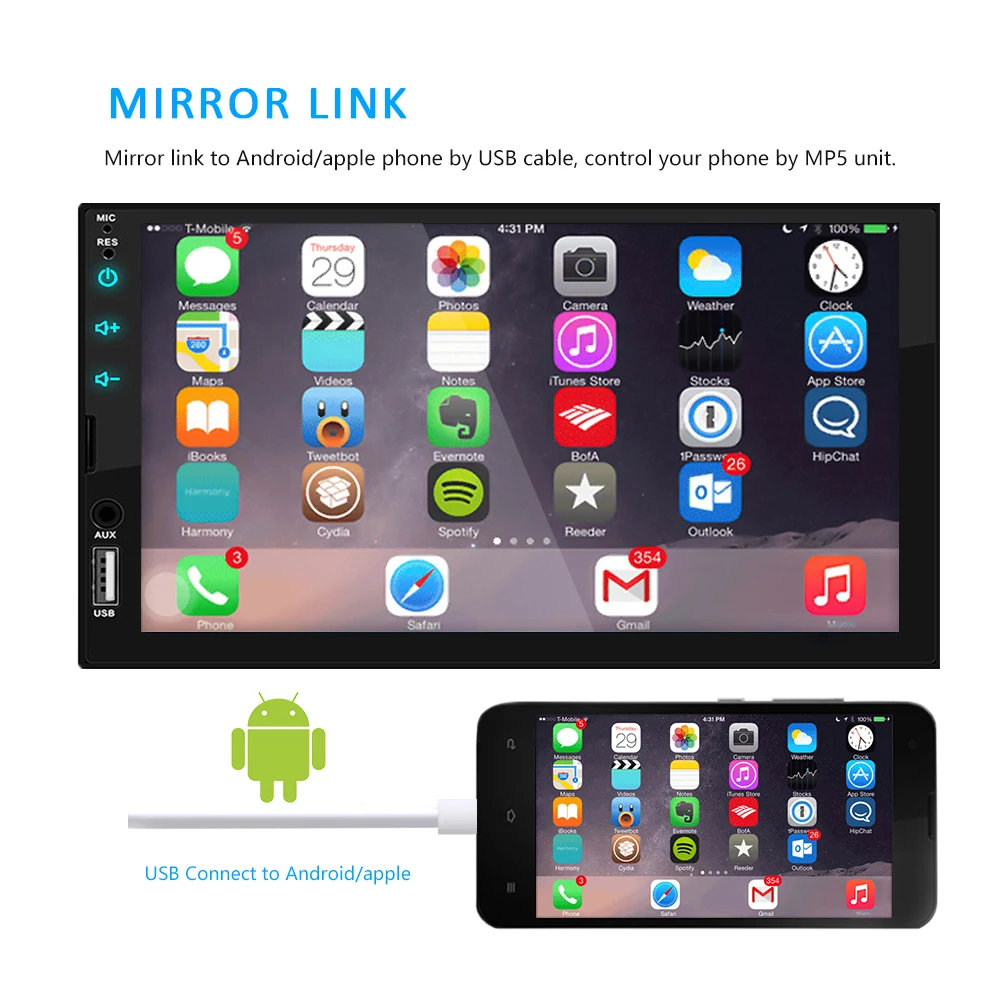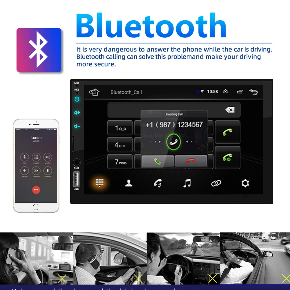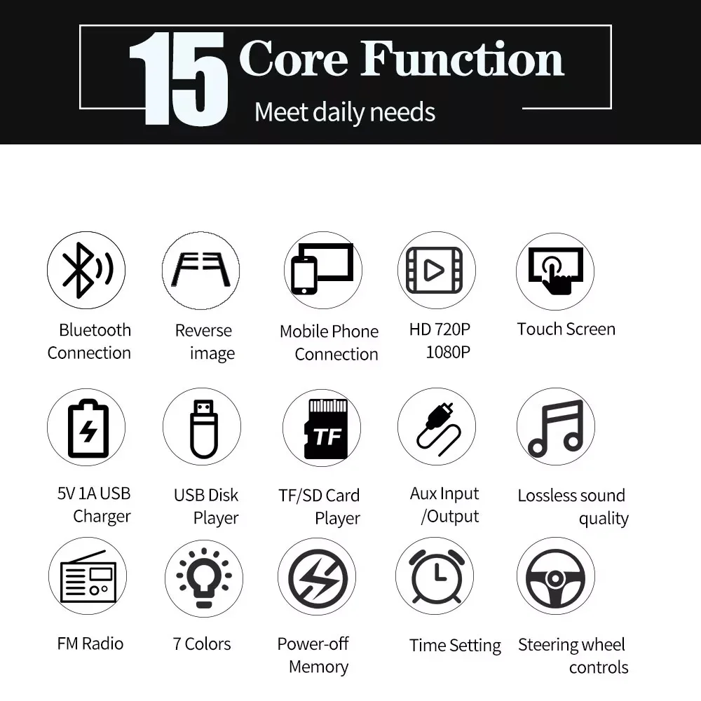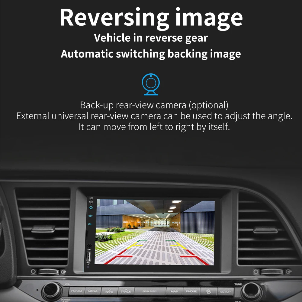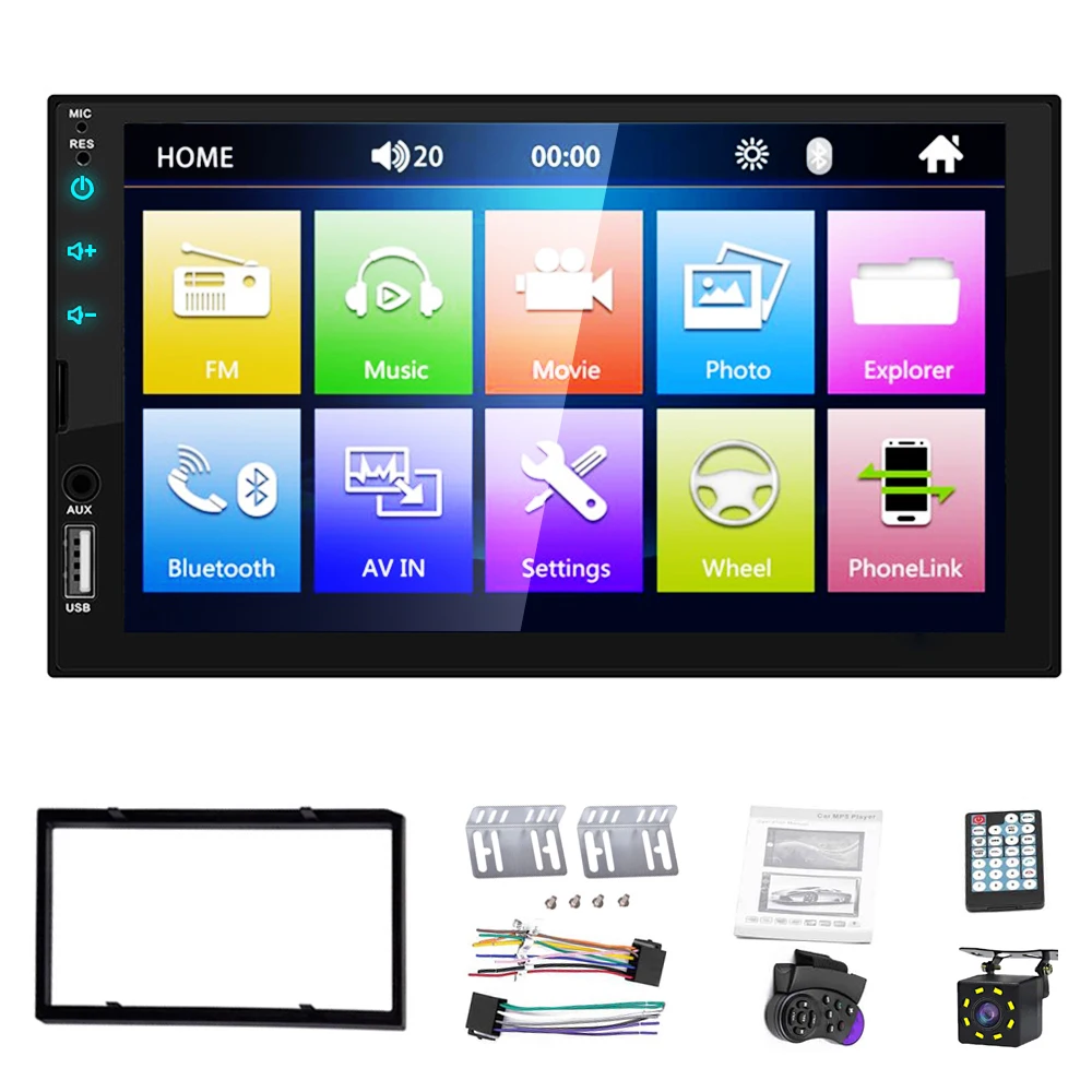 1. Lecteur MP5 de radio de voiture HD de 7 pouces 2 din avec écran tactile numérique. 2. Prise en charge de la connexion BT sans fil et de la fonction d'appel téléphonique mains libres. 3. Prise en charge de la FM et de l'entrée auxiliaire intégrée. 4. Prise en charge de l'emplacement pour carte TF (jusqu'à 32 Go) et de l'interface USB standard. 5. Prise en charge de la fonction d'entrée de la caméra arrière. 6. Horloge et date d'affichage numérique de 24 heures. 7. Peut charger pour un téléphone portable ou d'autres appareils USB. 8. Il peut prendre en charge le lecteur de films 1080P 9. Feux arrière colorés du bouton d'alimentation pour la décoration de votre voiture.