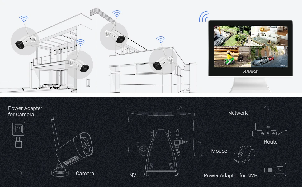 * Il suffit de brancher le NVR (moniteur) et les caméras vidéo WiFi aux prises pour une visualisation et un enregistrement instantanés en direct.