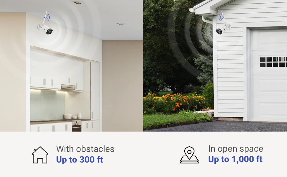 · Le NVR et les caméras vidéo sans fil se connectent l'une à l'autre via leur technologie WiFi privée et exclusive jusqu'à 1 000 pieds de distance.