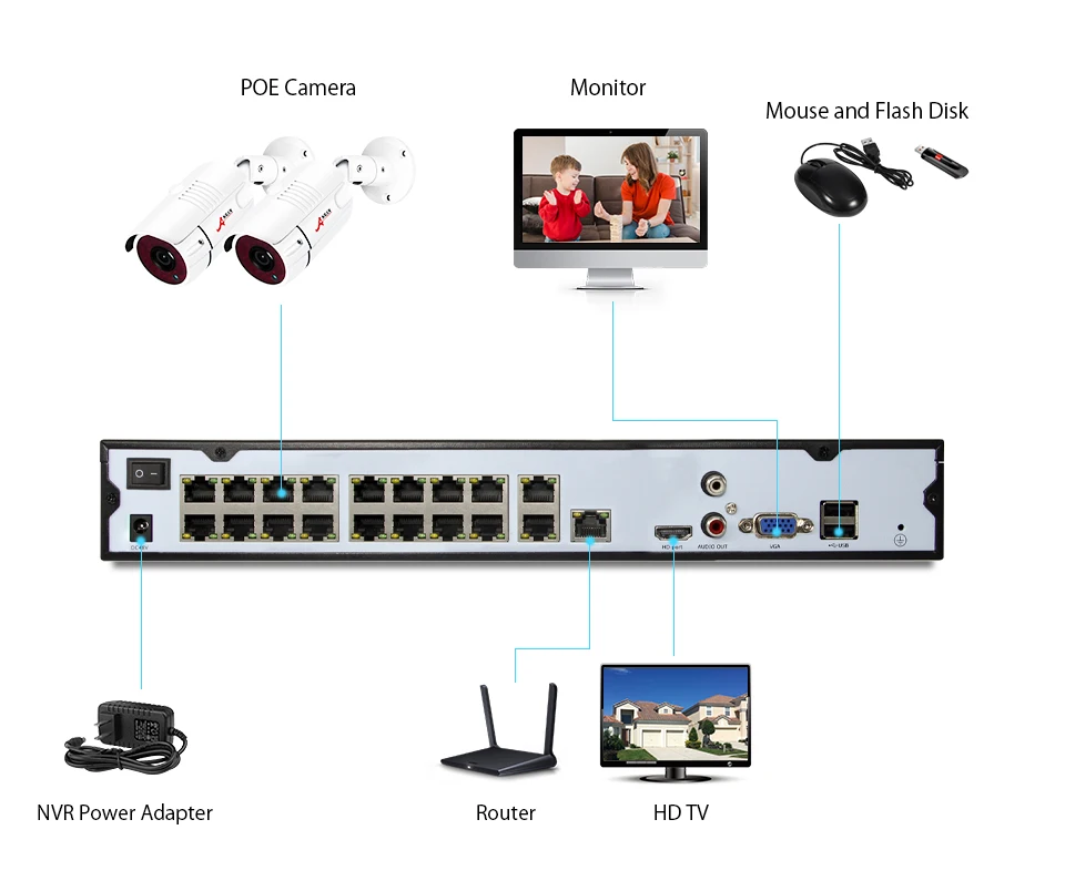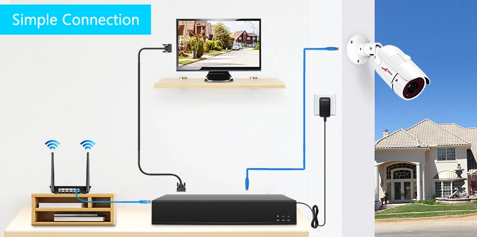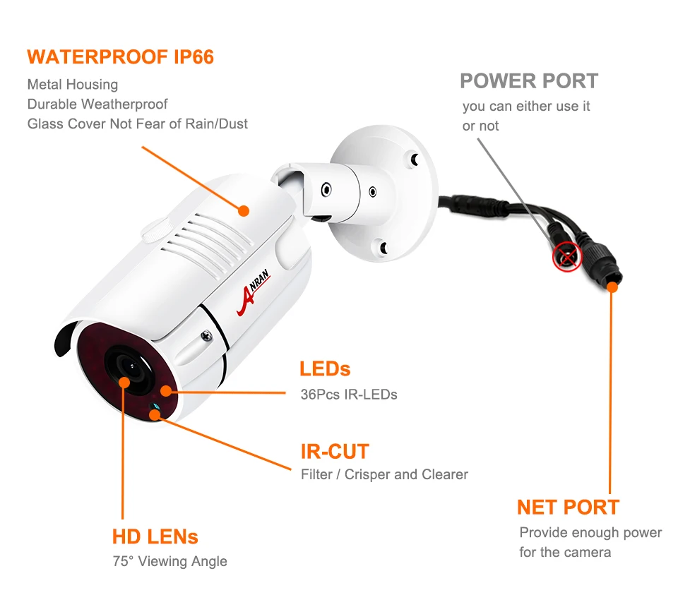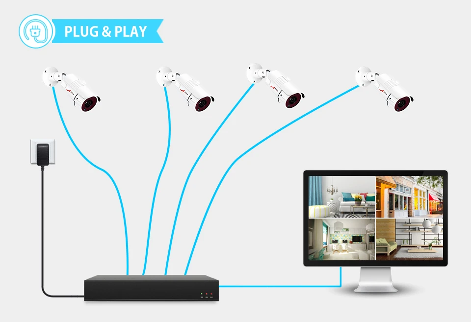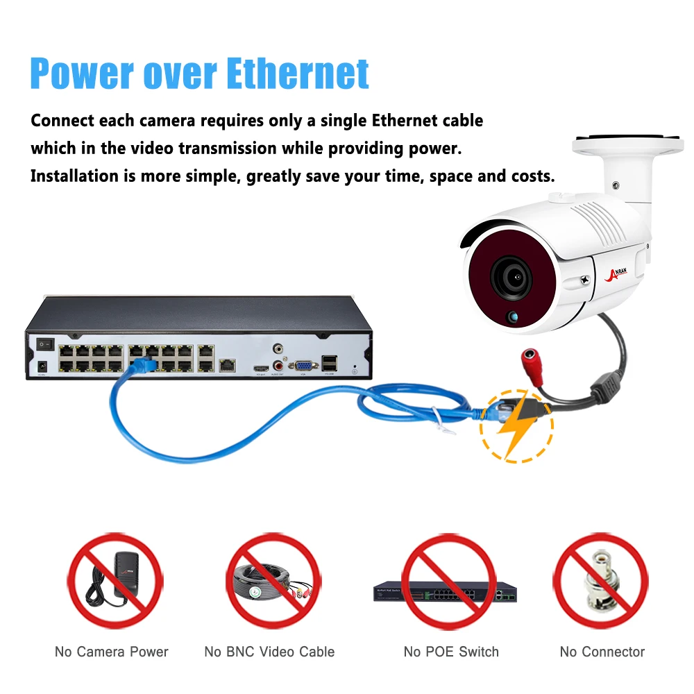 Ce système de caméra de sécurité sera opérationnel en un rien de temps grâce à la technologie Power-over-Ethernet (PoE). Tout ce qui est nécessaire pour connecter chacune de vos caméras de sécurité à votre NVR est un seul câble Ethernet. Ce câble fournit à la fois l'alimentation et la transmission vidéo.