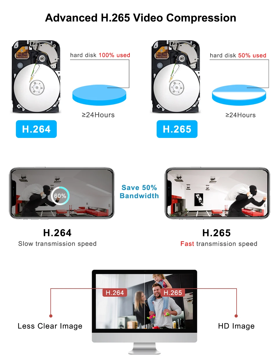 Votre caméra de sécurité et votre NVR sont tous deux équipés d'une compression vidéo H.265 à codage vidéo à haute efficacité. Cette technologie d'encodage compresse efficacement la taille des fichiers. En fait, il peut compresser des tailles de fichiers jusqu'à 50 % de plus que les fichiers utilisant la technologie d'encodage précédente (H.264), sans aucune dégradation notable de la qualité.