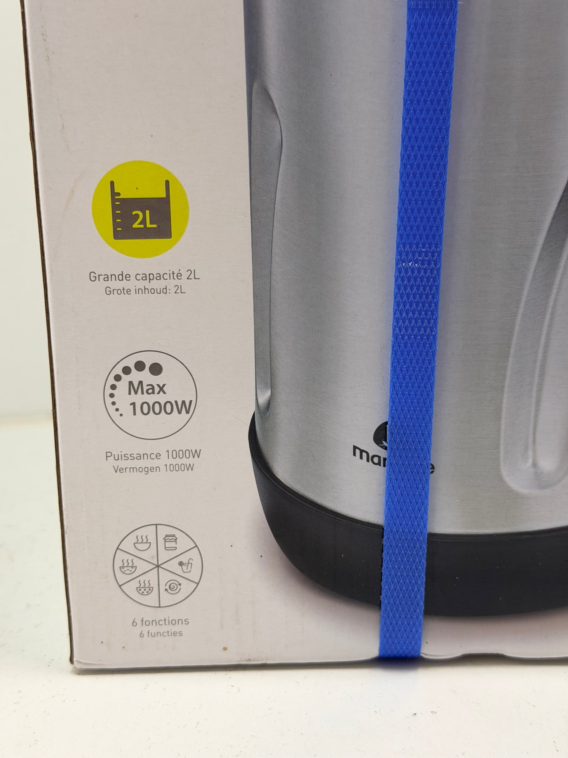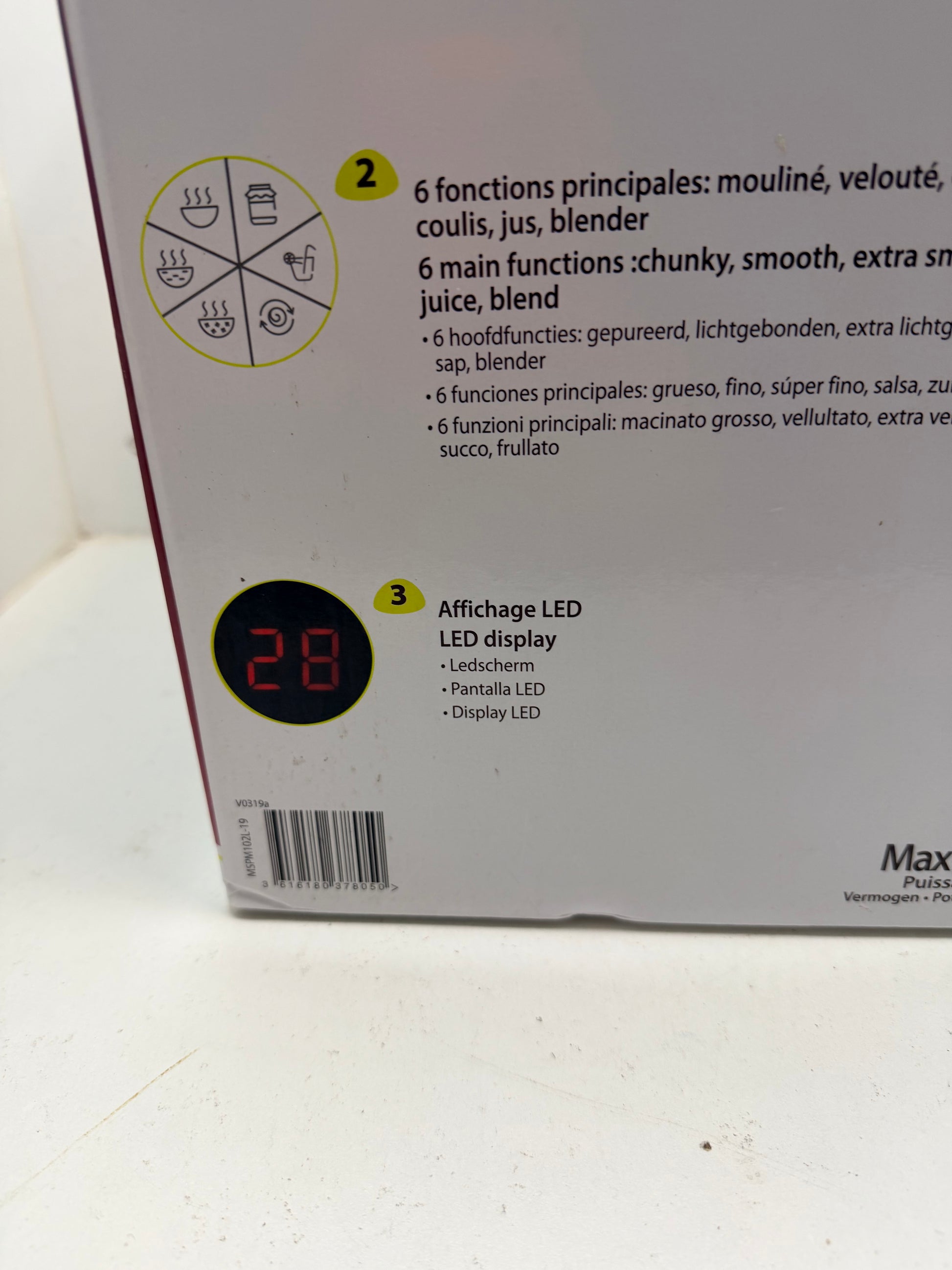Appareil à soupe, bol en acier inoxydable avec bec verseur, contenance jusqu'à 1,6 L. 6 fonctions principales : mouliné pour des soupes avec morceaux, velouté, extra velouté, coulis, jus, blender. SA puissance de 1000 Watts vous permet des cuissons rapides.