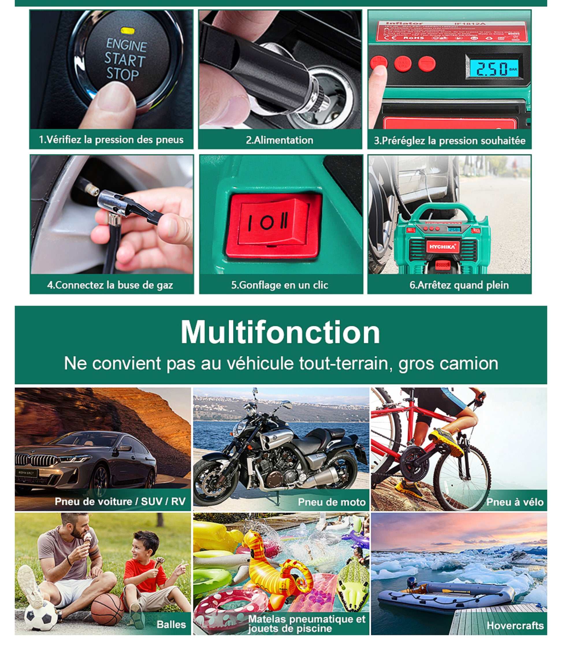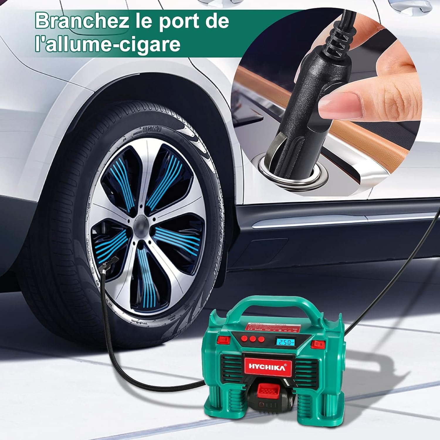 Compresseur d'air Portatif 18V HYCHIKA- Gonfleur Pneus Voiture, Alimenté par 2A Batterie/Allume Cigare, Affichage Numérique de la Pression, LED Intégré, Convient pour Voiture, Moto