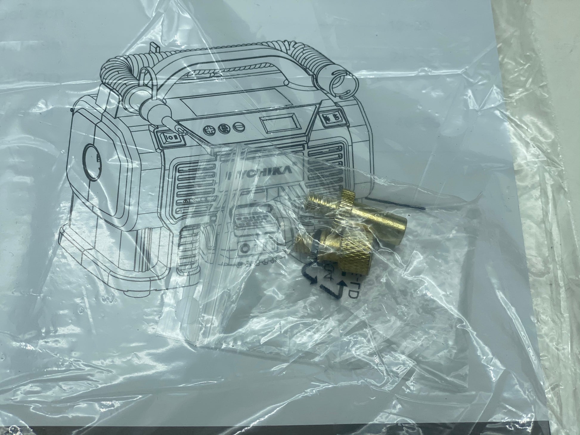 HYCHIKA 18V Compresseur d'Air Portatif, 1*2.0A Batterie rechargeable, 1*Chargeur, 5*Adaptateur de buse (pour balle, vélo), 1*Tuyau d'air basse pression, Manuel d'utilisation.
