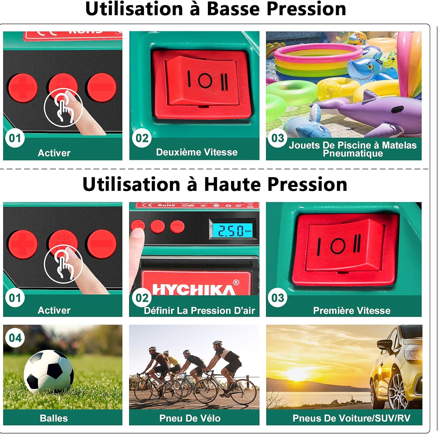 Gonflage de pneu, Pour le gonflage et le dégonflage d'articles à basse pression mais à grande capacité tels que les flotteurs, les coussins d'air et les bouées., Gonflage d'articles à haute pression tels que les pneus de voiture et de bicyclette, les ballons de sport, etc.