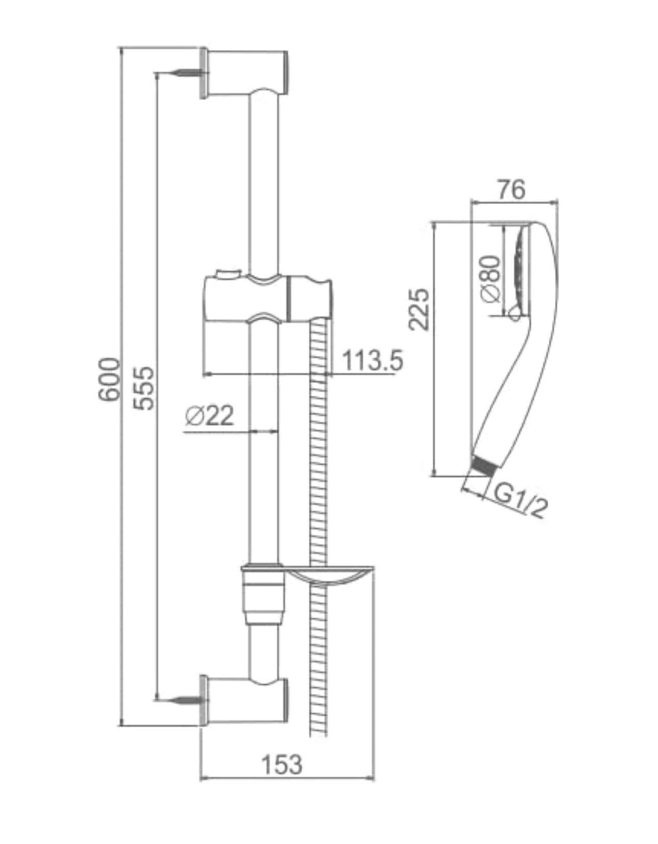- 1 x Barre de douche 1 x Support de douche 1 x Douche de main 1 x Tuyau de douche 1 x Porte-savon douche