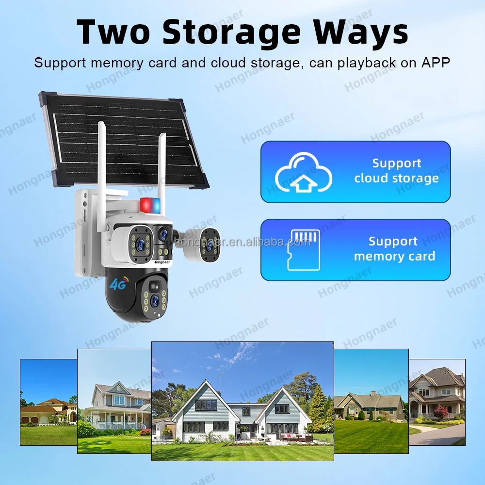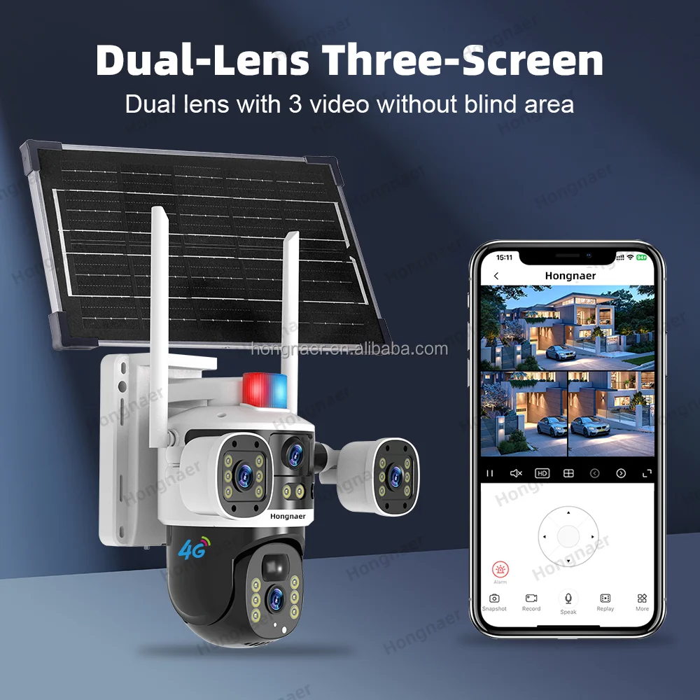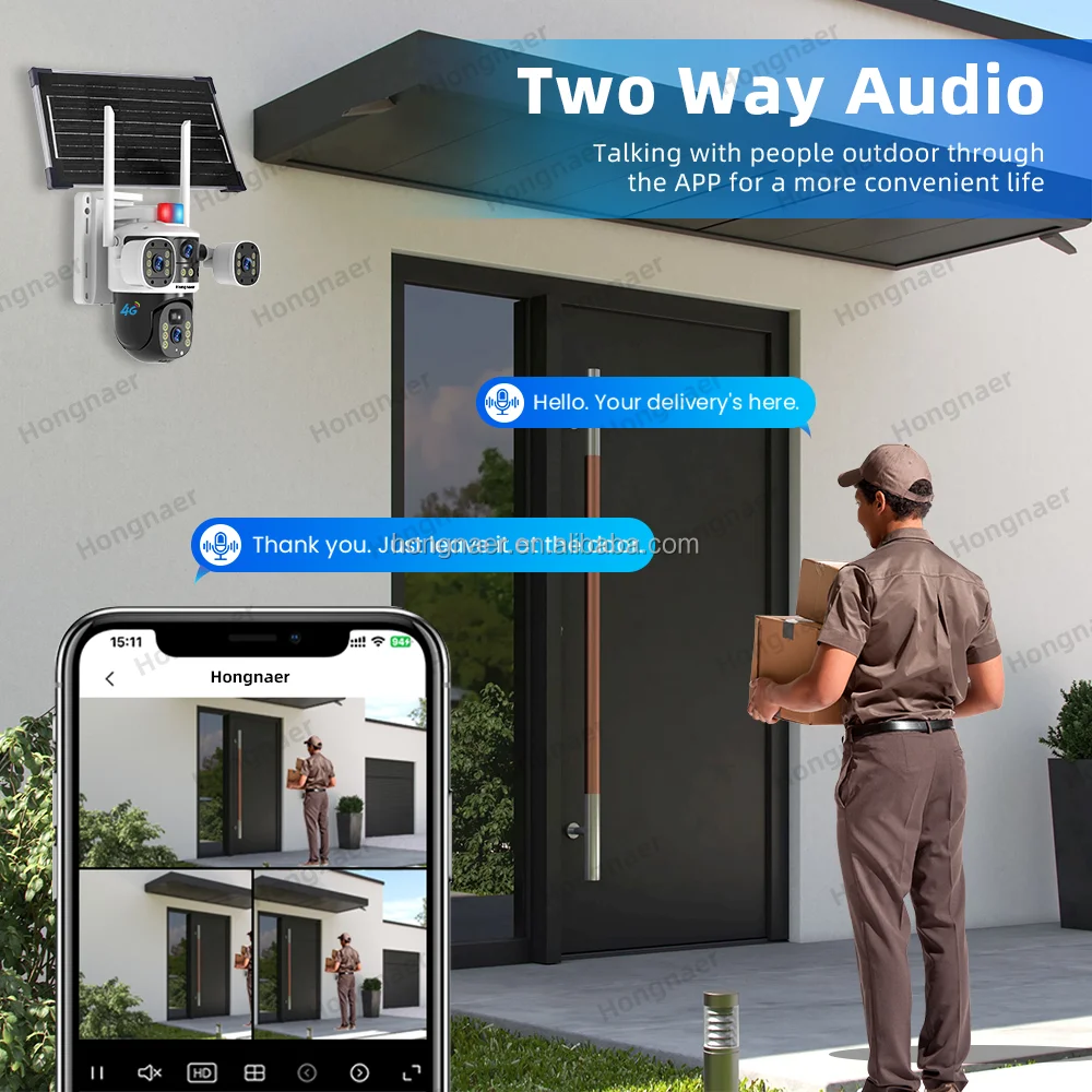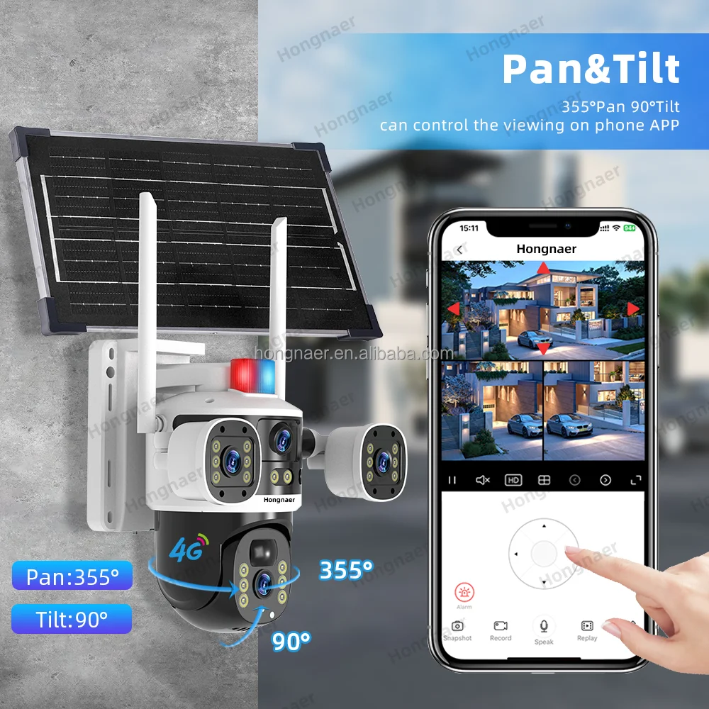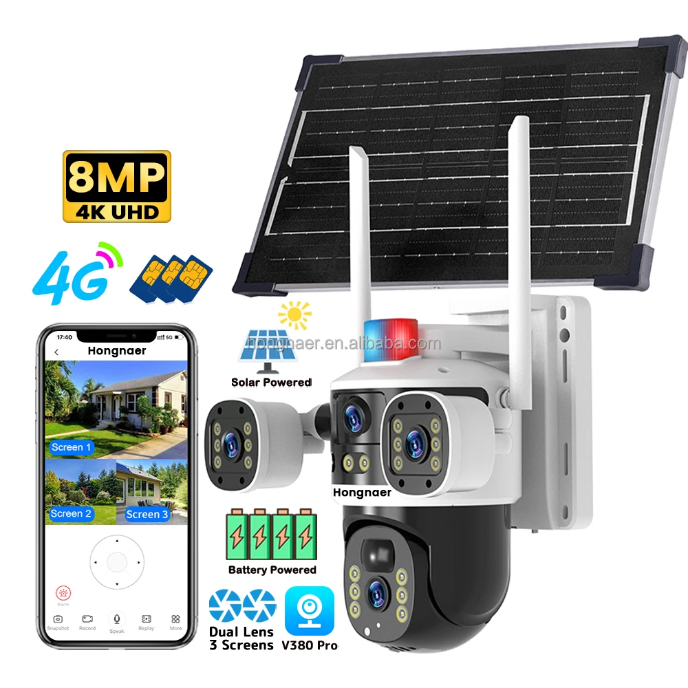 Hongnaer Caméra de surveillance PTZ sans fil à énergie solaire extérieure Double objectif V380 Pro 8MP 4K Sécurité 4G Carte SIM CCTV Caméra solaire