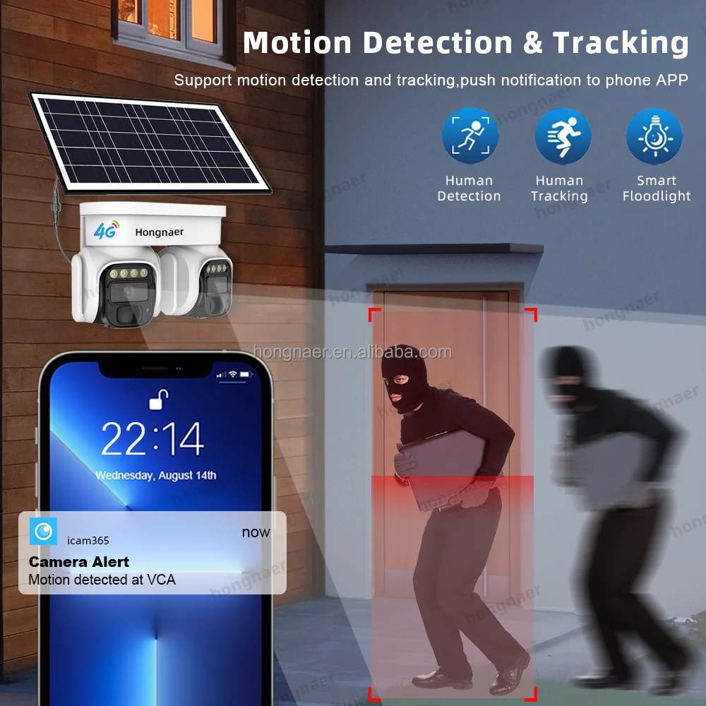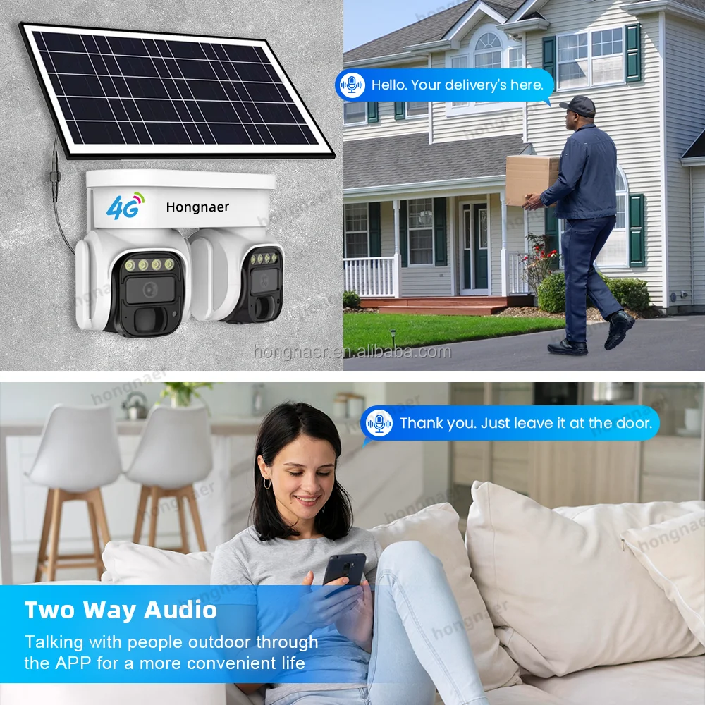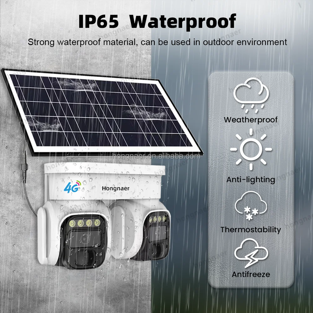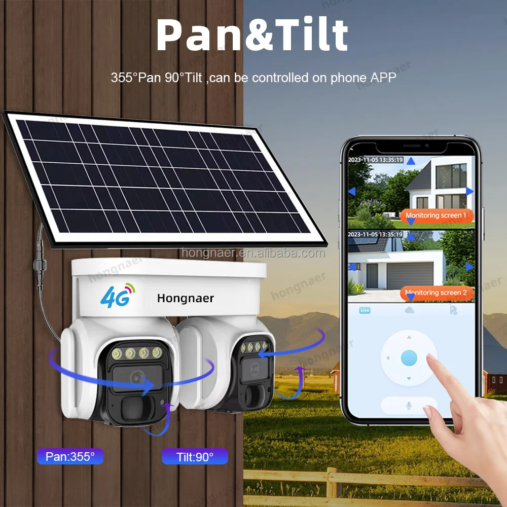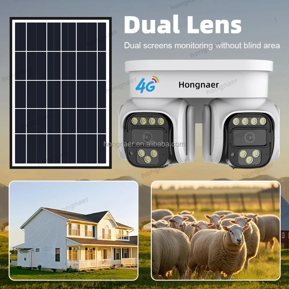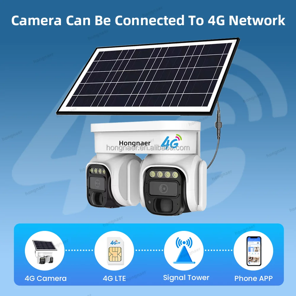 Hongnaer Double Objectif 8MP 4G LTE Panneau Solaire Basse Puissance PTZ Caméra De Sécurité Surveillance Extérieure 4K 4G Carte Sim Caméra Solaire CCTV