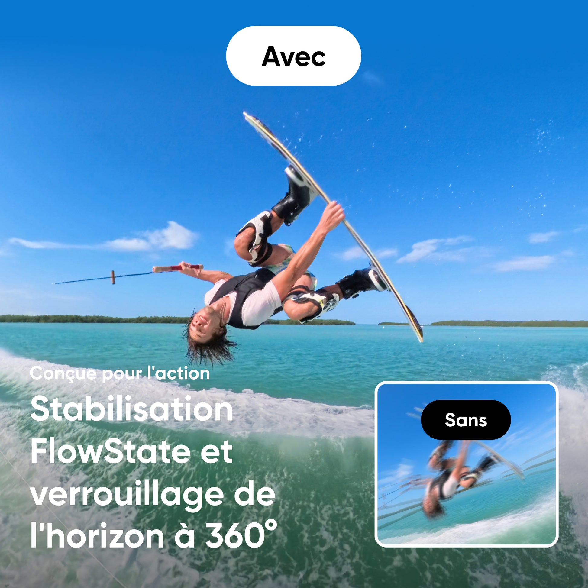 Stabilisation FlowState et verrouillage de l'horizon à 360° pour des vidéos fluides et stables, quelle que soit l'action. Robuste et étanche jusqu'à 10 m.
