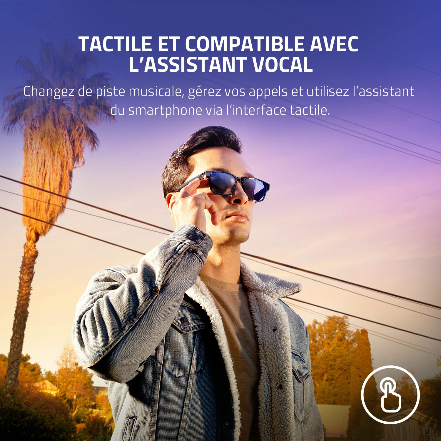 - Tactile et compatible avec l’assistant vocal pour des commandes pratiques, intuitives et intelligentes: Changez de pistes musicales, lisez ou mettez vos médias sur pause, gérez les appels et activez l’assistant vocal de votre smartphone, le tout à partir de l’élégante interface tactile de vos lunettes.