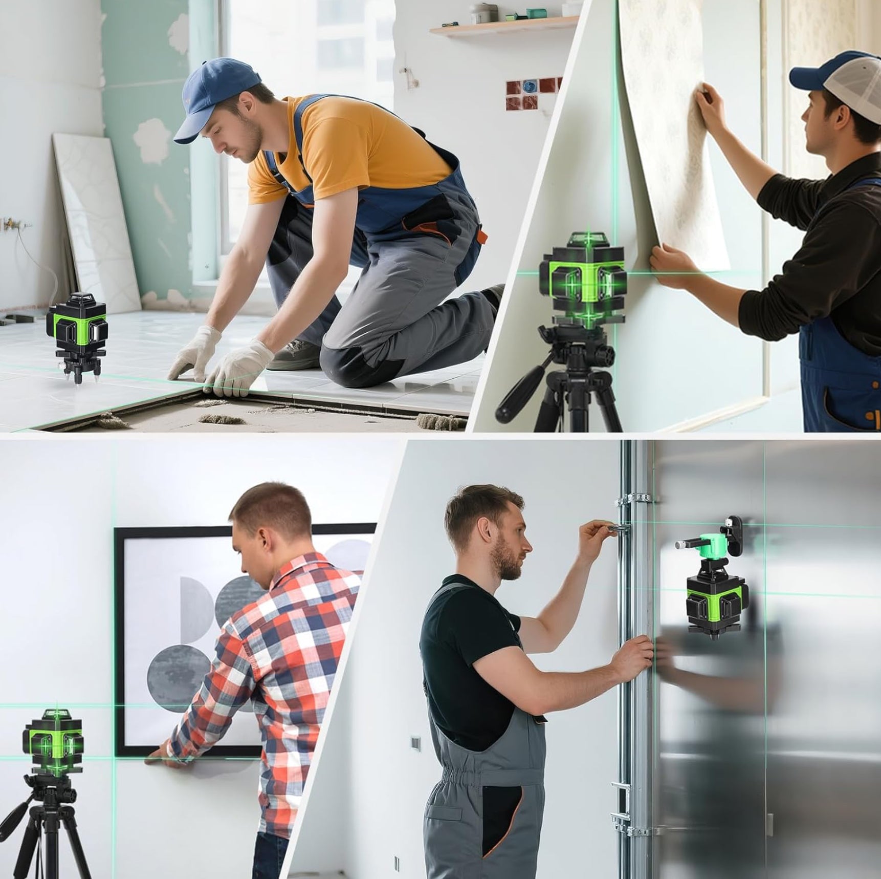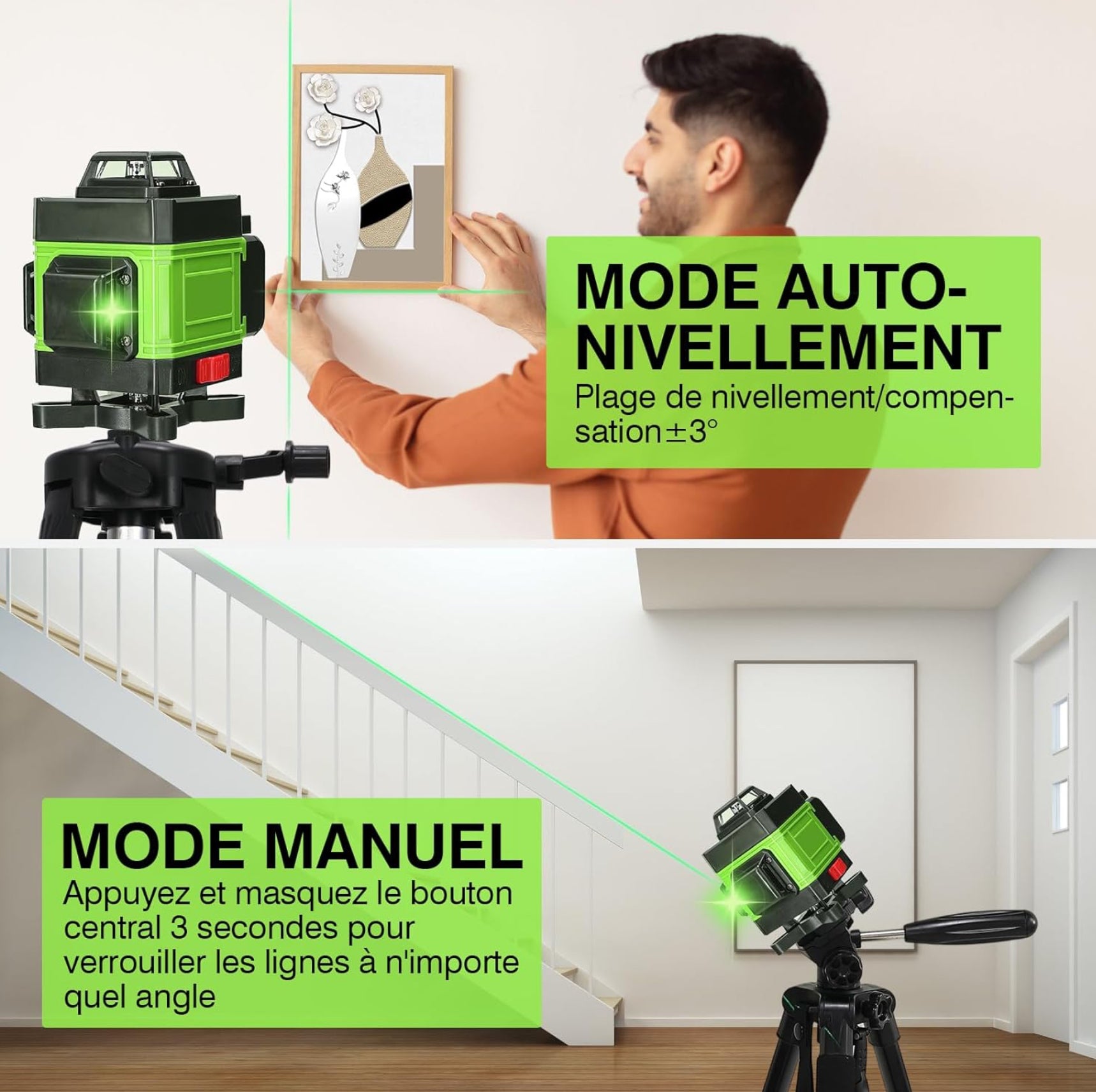 Niveau Laser 4D 16 Lignes ±3° Niveau Automatique, 2x2400 mAh Batteries Rechargeables IP54, 1.2M 3-Réglable trépied