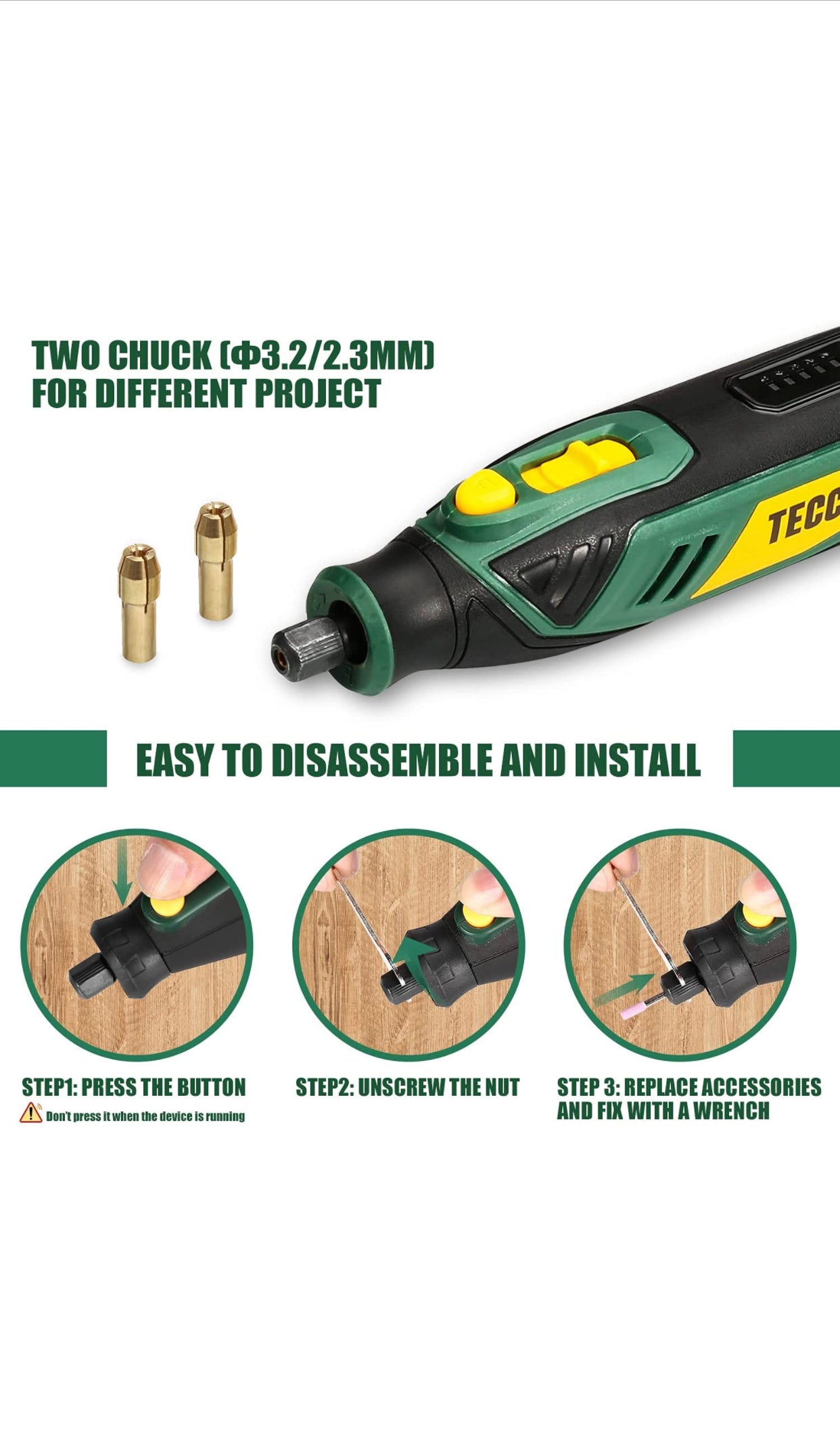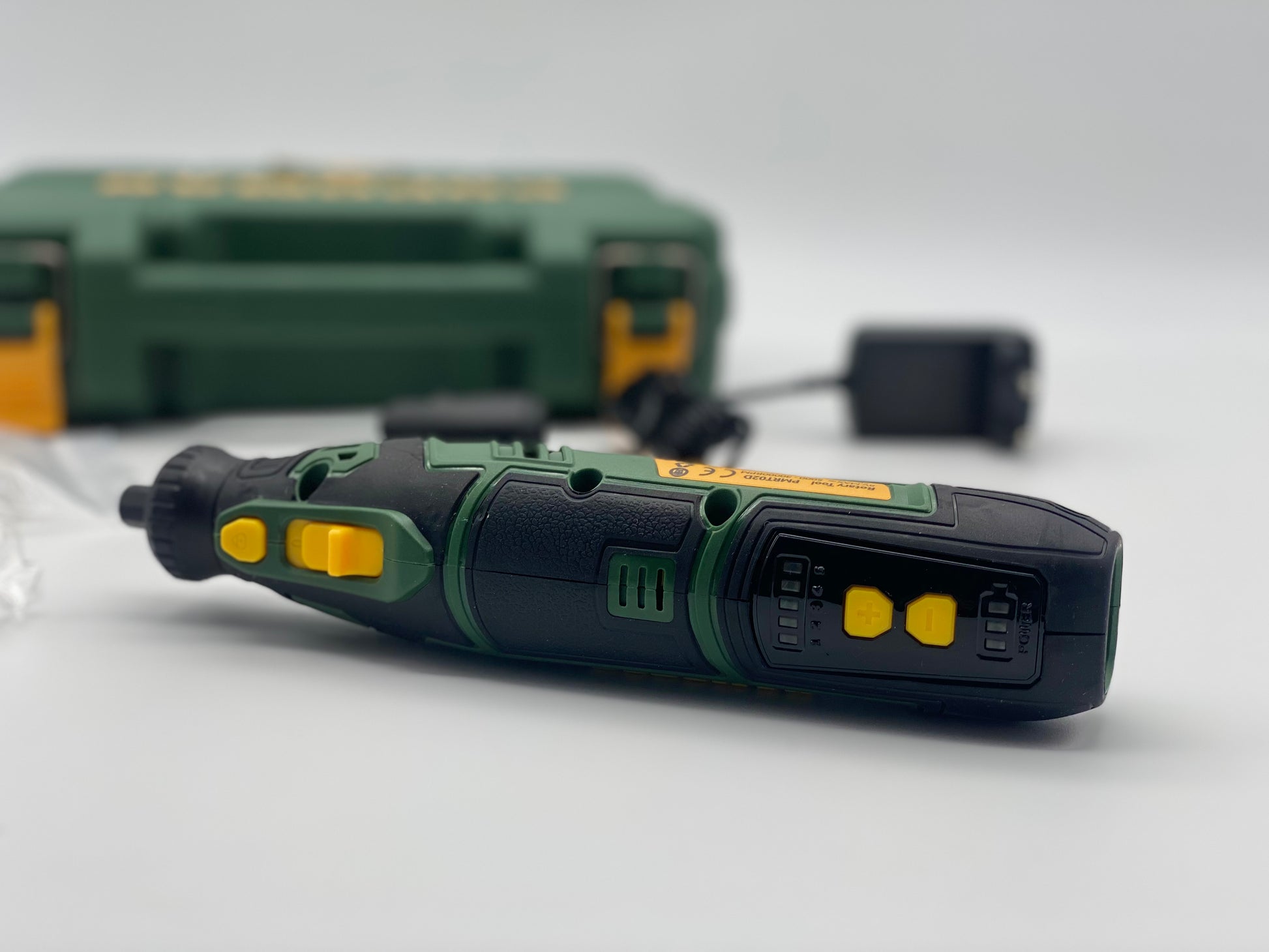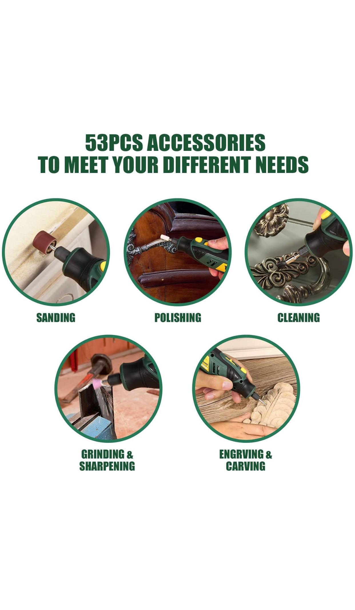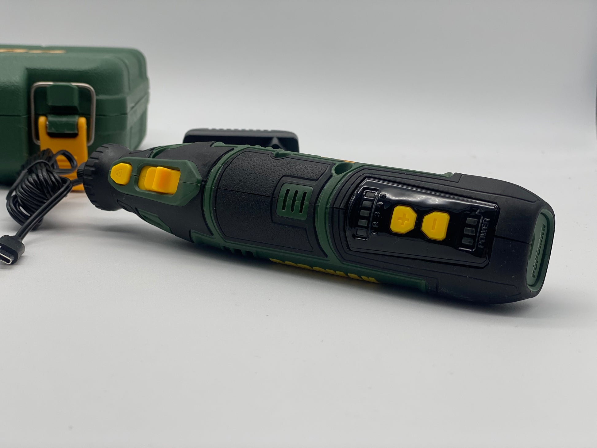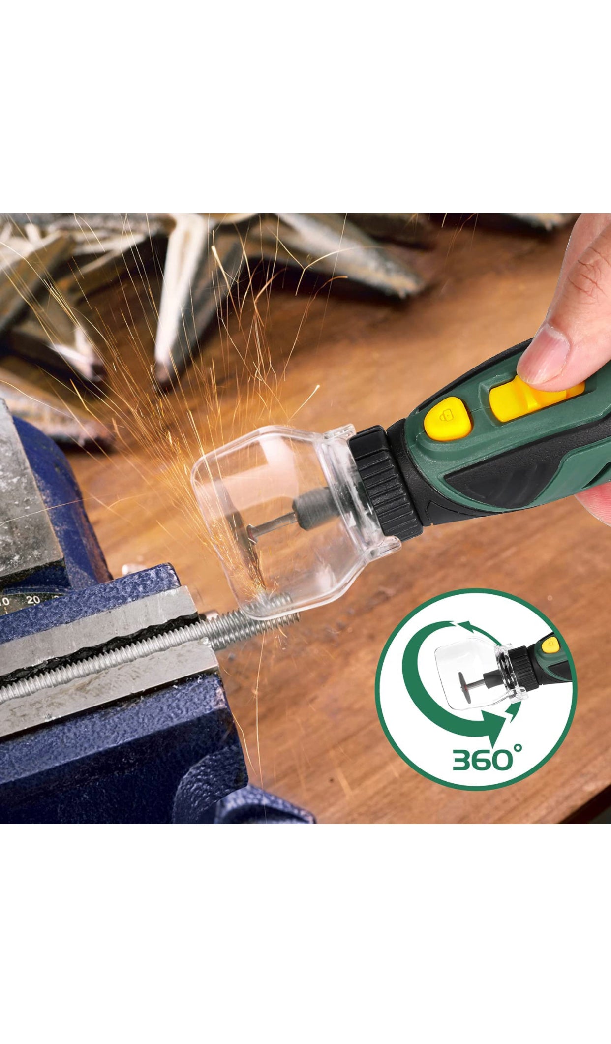 Ajustez en toute transparence à la vitesse idéale de 5 000 à 25 000 pour un contrôle et une maniabilité optimaux. La sélection à 5 vitesses peut s'appliquer précisément à différentes situations. Vous pouvez facilement contrôler les fines sculptures sur bois, verre, métal, plastique, carreaux et autres. L'outil rotatif sans fil est équipé d'un excellent moteur 4V, qui génère une puissance forte et constante.