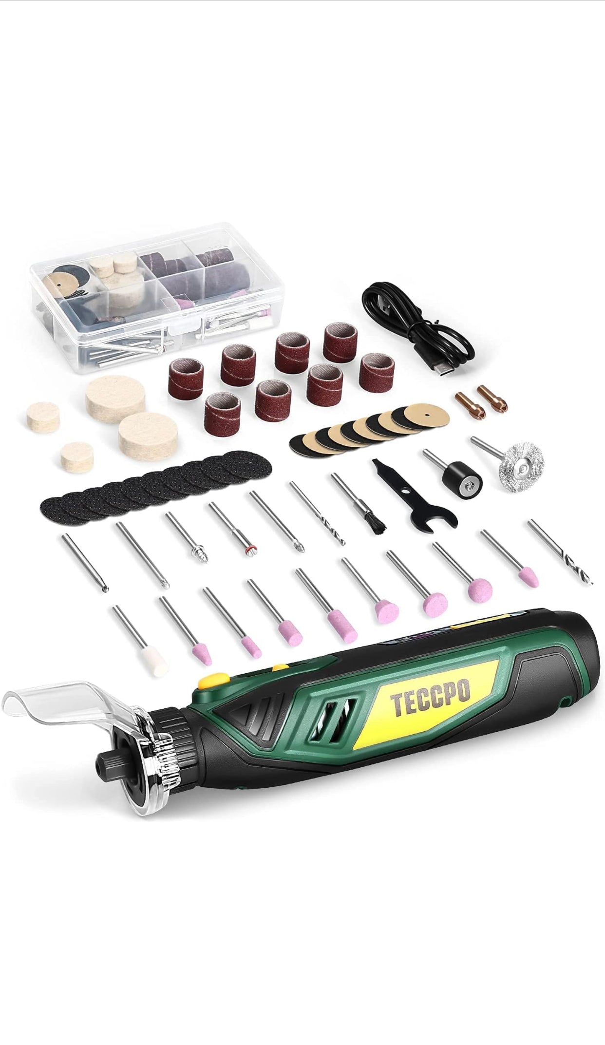 Outil Rotatif Multifonction, 4V Outil Rotatif Sans-fil 2.0Ah Batterie, 5-Vitesses, Type-C USB, 0-25000RPM, 53pcs Accessoires pour Graver, Découper, Percer, Polir, Nettoyer-TECCPO