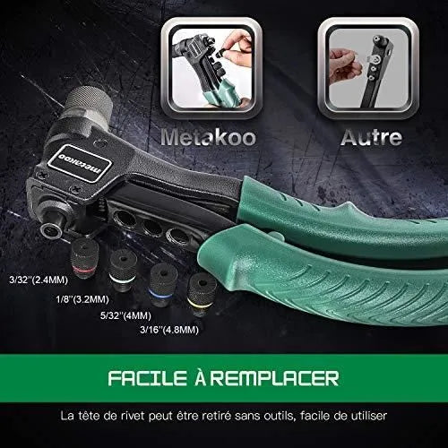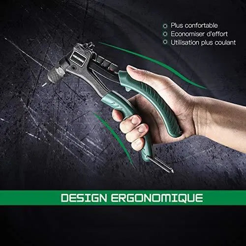 La pince à rivet est un outil manuel à une main avec 4 têtes interchangeables sans outil avec code couleur.
