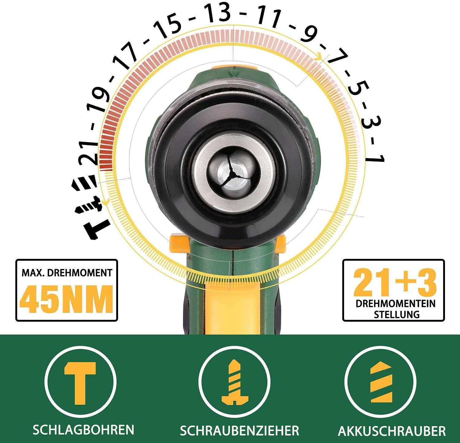 - 【21 niveaux de couple + 3 modes】Visseuse sans fil 18 V avec mode de travail 3 en 1 : perçage, perçage à percussion et tournevis, il peut être utilisé pour percer des trous dans les murs en ciment, le bois, le métal, le plastique, etc. 21 niveaux de couple permettent un serrage et un perçage puissants sur différents matériaux. La transmission à 2 vitesses (0-400/1500 tr/min) offre jusqu'à 45 Nm de couple lors du perçage et du serrage
