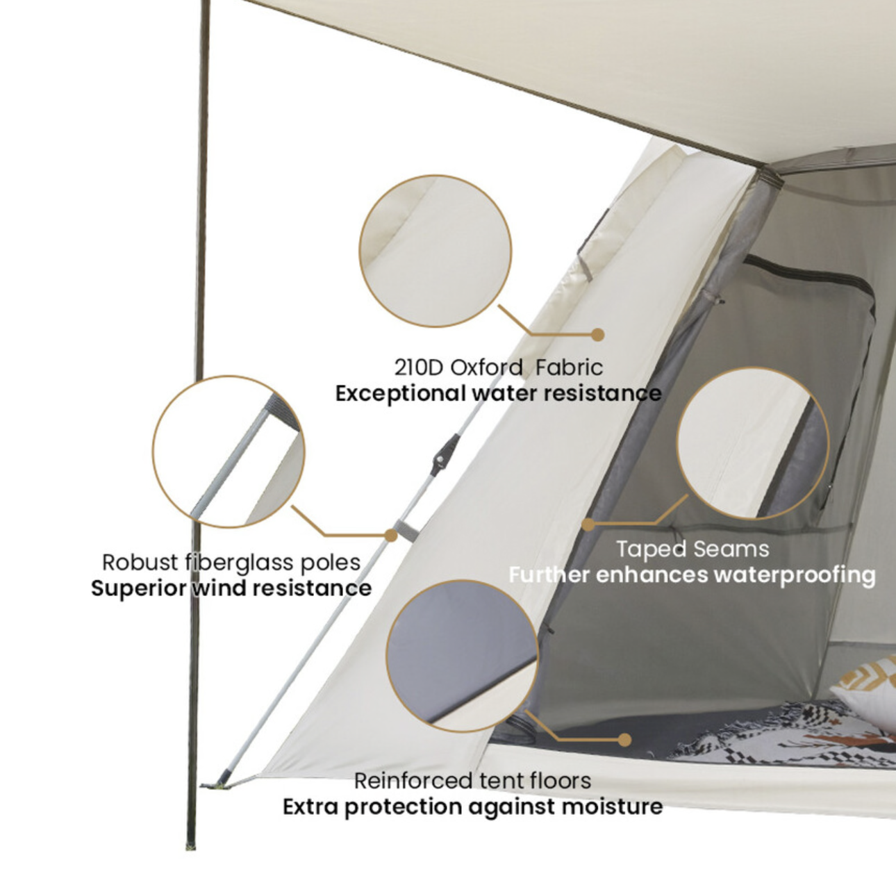 - Tissu Oxford durable. Fabriquée à partir de tissu Oxford épais de haute qualité, cette tente est résistante à l'usure, imperméable et conçue pour résister à diverses conditions extérieures.