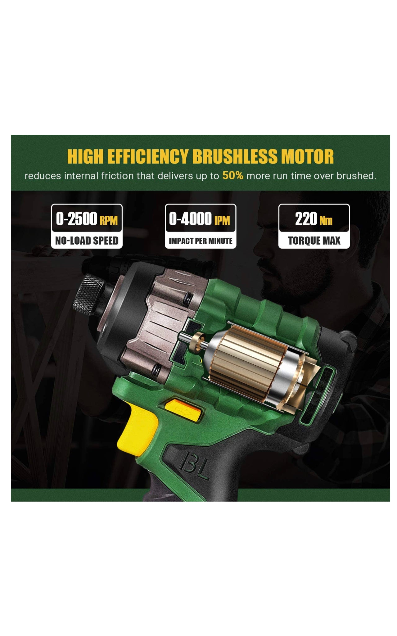 Visseuse à Chocs, Boulonneuse à chocs Brushless, 220Nm 3 Vitesses, 0-4000IPM, 6.35mm Mandrin Rapide, 3 Lampes LED, Inclure Batterie Lithium 2.0Ah, Chargeur, Mallette neuve