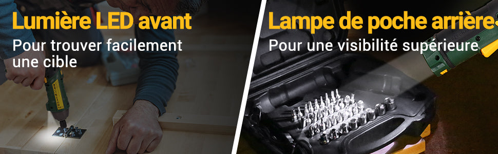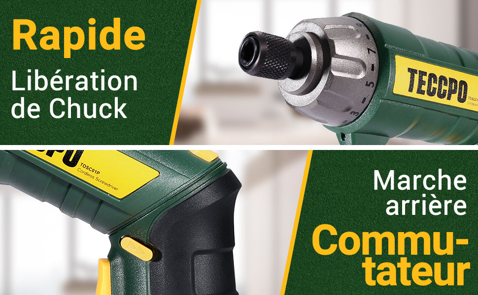 - 6Nm COUPLE MAX MANDRIN À CHANGEMENT RAPIDE Max couple 6Nm, vitesse maximale 180 tr min et convient bien au vissage à la maison. Le mandrin à changement rapide de 6,35 mm facilite le des accessoires. Avec interrupteur positif et négatif est facile pour l'installation et le retrait des vis.