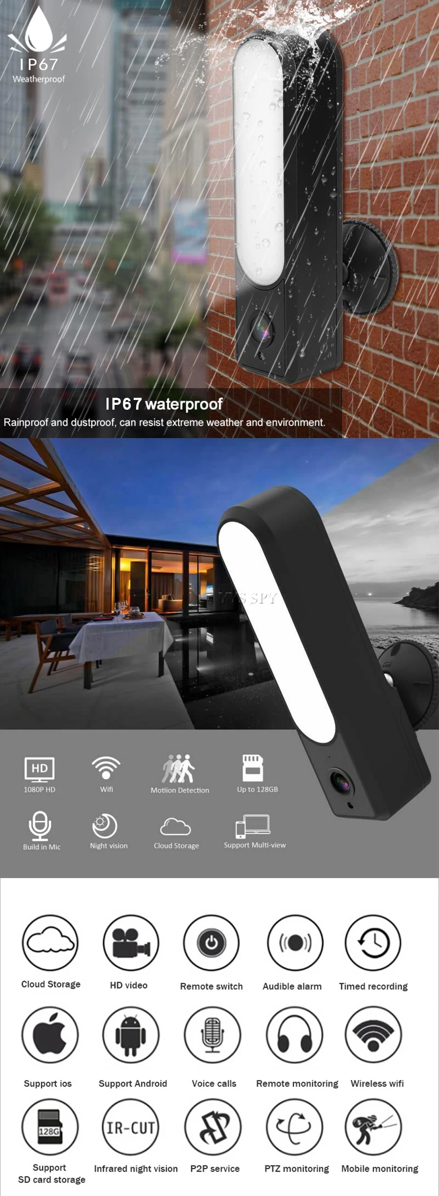 * support for 8~128G TF card; free one month cloud storage.